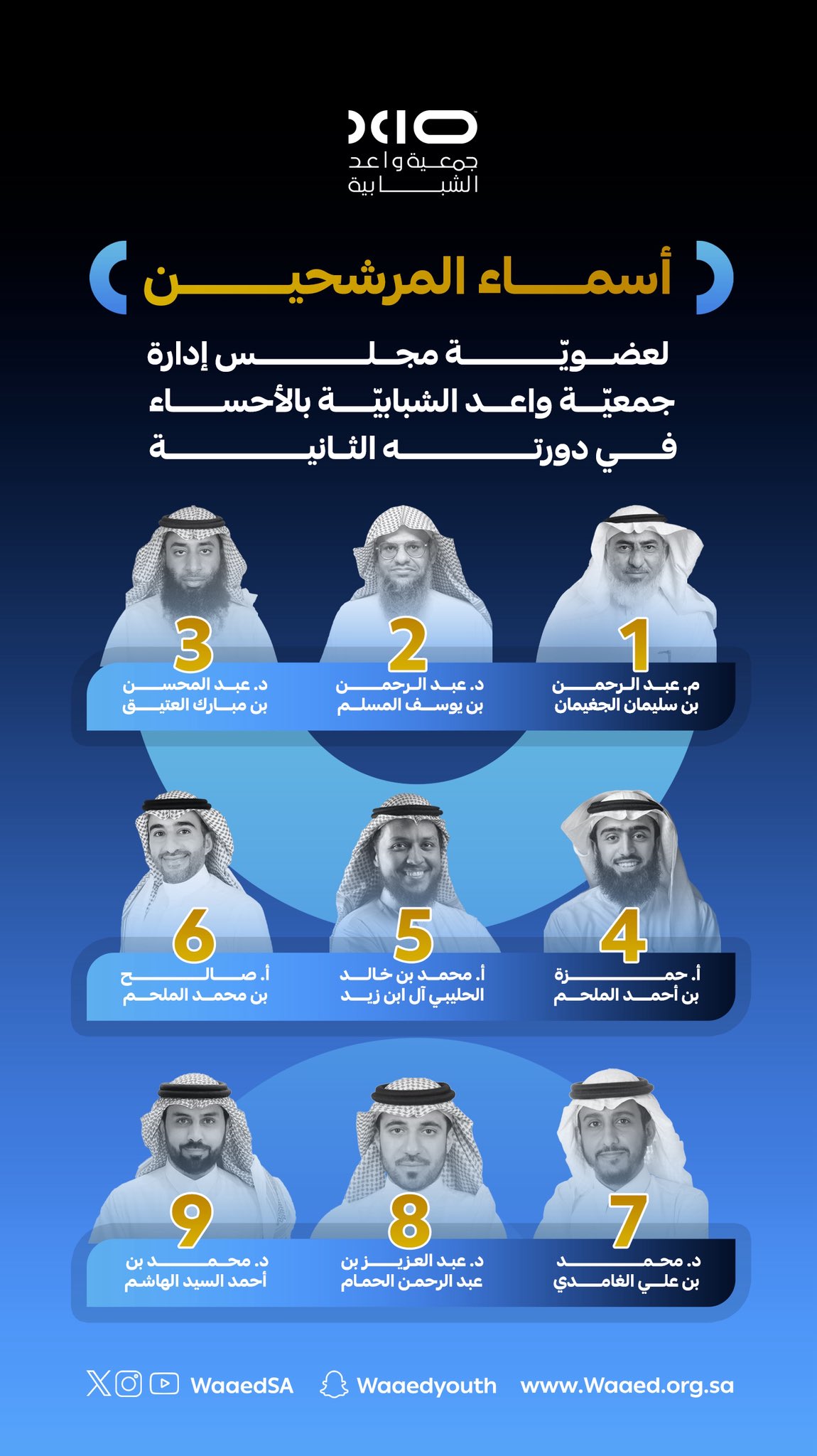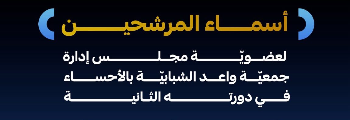 أعلنت جمعية واعد الشبابية بمحافظة الأحساء عن المرشحين لعضوية مجلس الإدارة في دورته الثانية، وذلك وفق اللوائح والأنظمة المعتمدة من وزارة الموارد البشرية والتنمية الاجتماعية.