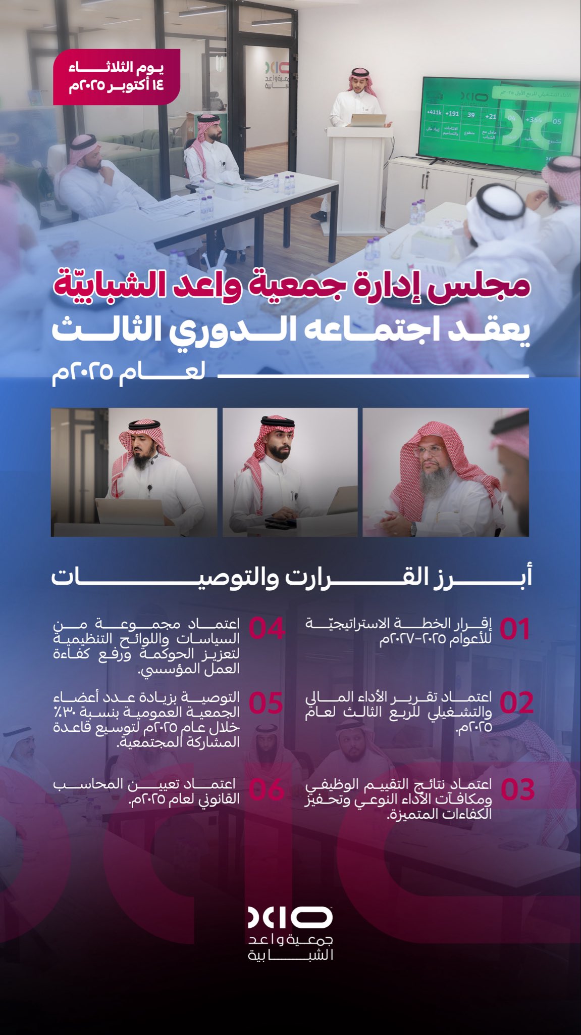 عقد مجلس إدارة جمعية واعد الشبابية يوم الثلاثاء 14 أكتوبر 2025م اجتماعه الدوري الثالث لعام 2025م، حيث جرى خلاله إقرار الخطة الاستراتيجية للأعوام 2025-2027م، واعتماد تقرير الأداء المالي والتشغيلي للربع الثالث لعام 2025م، واعتماد نتائج التقييم الوظيفي ومكافآت الأداء النوعي وتحفيز الكفاءات المتميزة، إلى جانب اعتماد مجموعة من السياسات واللوائح التنظيمية لتعزيز الحوكمة ورفع كفاءة العمل المؤسسي، والتوصية بزيادة عدد أعضاء الجمعية العمومية بنسبة 30٪ خلال عام 2026م لتوسيع قاعدة المشاركة المجتمعية، كما تم اعتماد تعيين المحاسب القانوني لعام 2025م.
